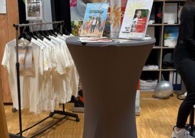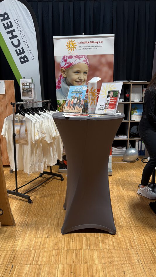 Viele Besucherinnen und Besucher fanden sich an unserem Info-Stand ein, wo wir auch USB-Sticks mit zwei Filmen von Falkenlay-Film e.V. und Spendenshirts verkauften. Außerdem gab es zum Beda-Markt ein Gewinnspiel. Am ersten Tag konnte unser Team Katja Messerich (Mitarbeiterin der Geschäftsstelle) und Stefanie Valerius-Willems unter anderem auch die Teilnehmerinnen und Teilnehmer des Rundgangs zur Eröffnung des Beda-Markts begrüßen: Landrat Andreas Kruppert, Bürgermeister Heiko Jakobs, der erste Beigeordnete Michael Ringelstein, die zweite Beigeordnete Katharina Gangolf, Stadt- und Kreistagsmitglied Karina Kesse, der Landtagsabgeordnete Michael Ludwig, der Vorsitzende des Gewerbevereins Lars Messerich, das Vorstandsmitglied der Volksbank Trier Eifel eG Andreas Theis und der Vorstandsvorsitzende der Kreissparkasse Bitburg-Prüm Rainer Nickels besuchten unseren Info-Stand. Am gut besuchten zweiten Tag führten Eva Jammermann (Vorstandsmitglied Lichtblick Bitburg e.V.) und Rudolf Rinnen (1. Vorsitzender Lichtblick Bitburg e.V.) viele anregende und interessante Gespräche.